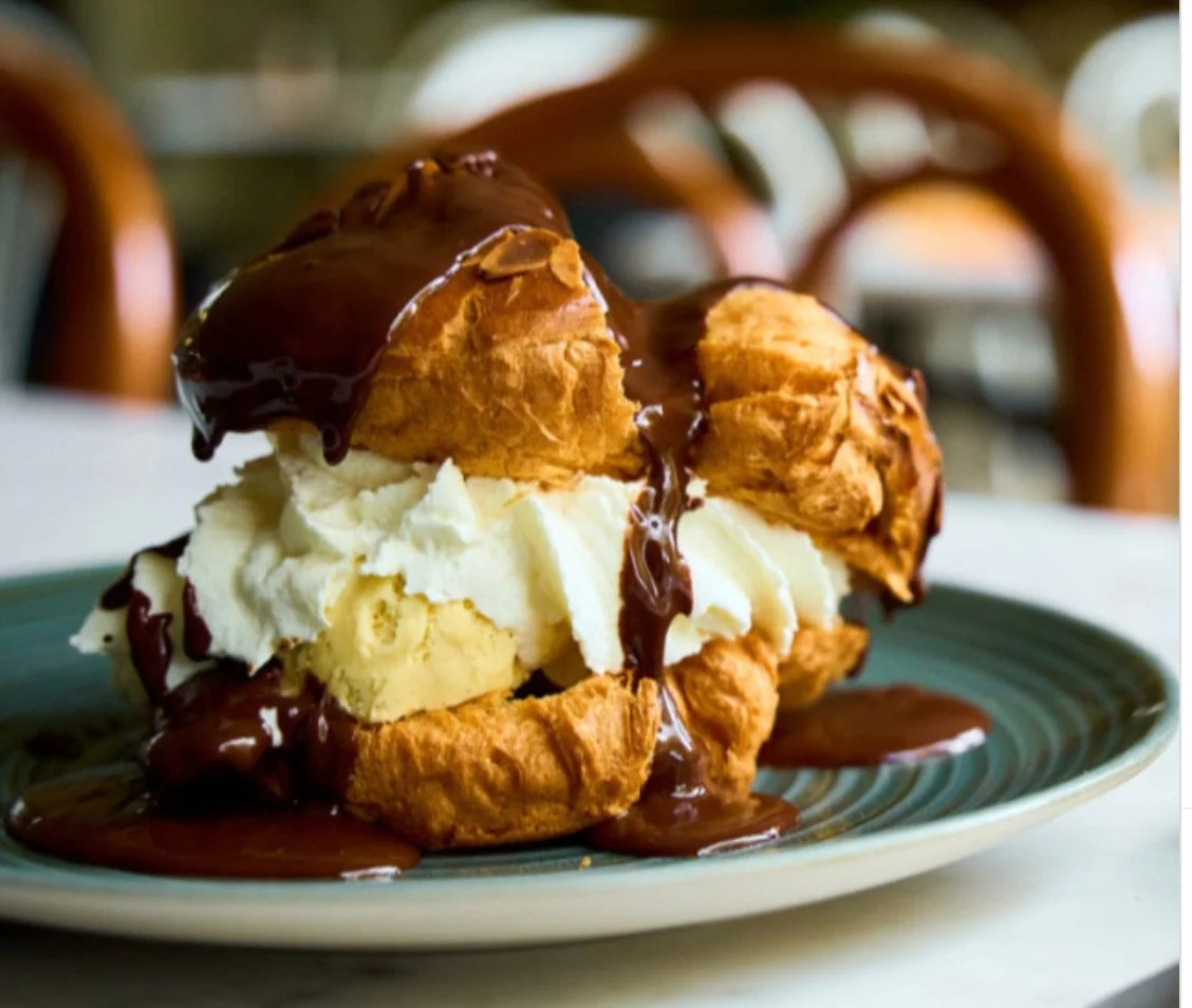 Egg cocotte, bacon, french sausage, 2 x charcuterie, 2 x cheeses, salad with burrata , pancake and syrup, yoghurt with muesli and honey, 1 x French pastry, fresh fruits, jam, bread and butter.